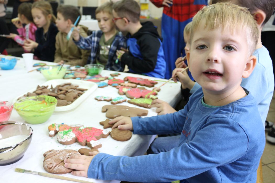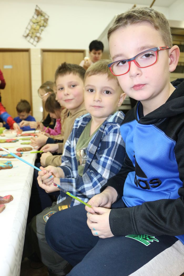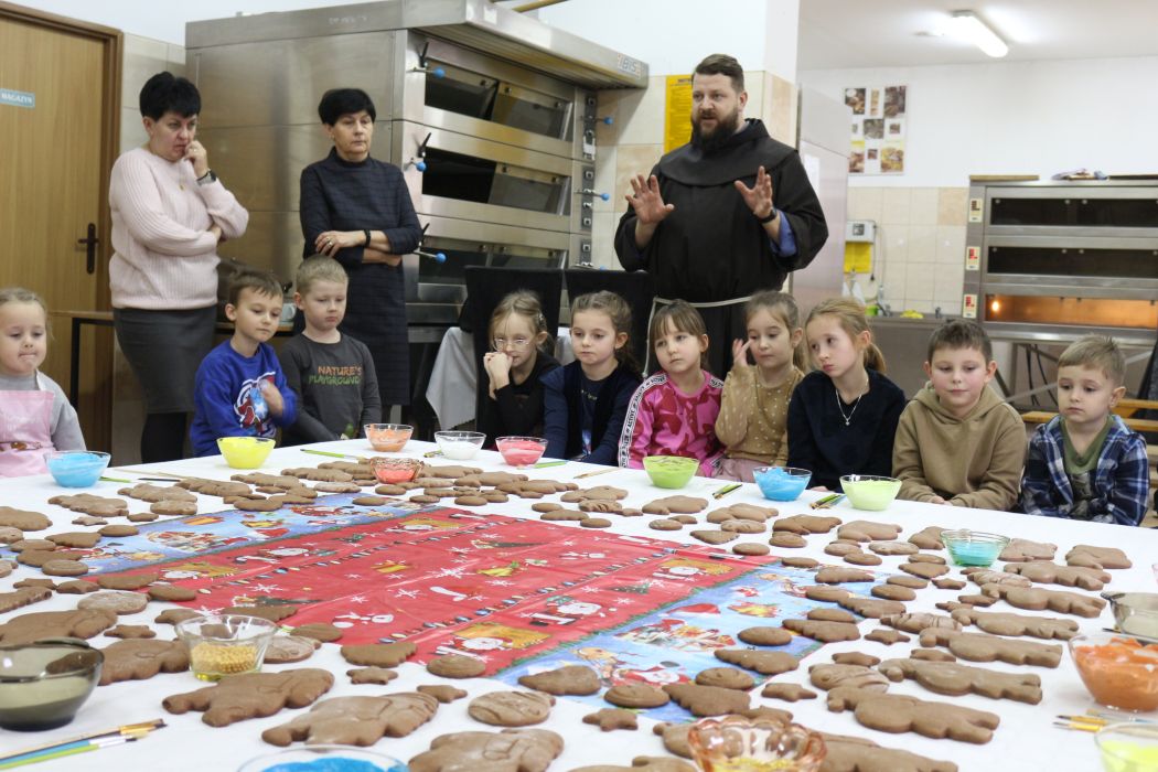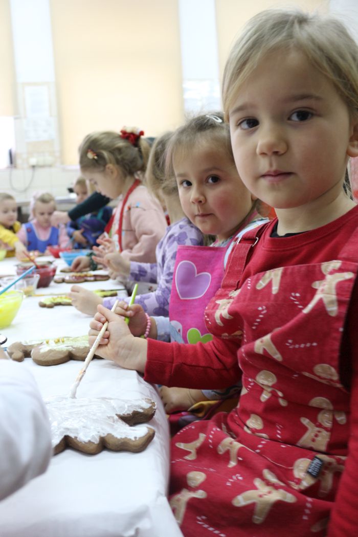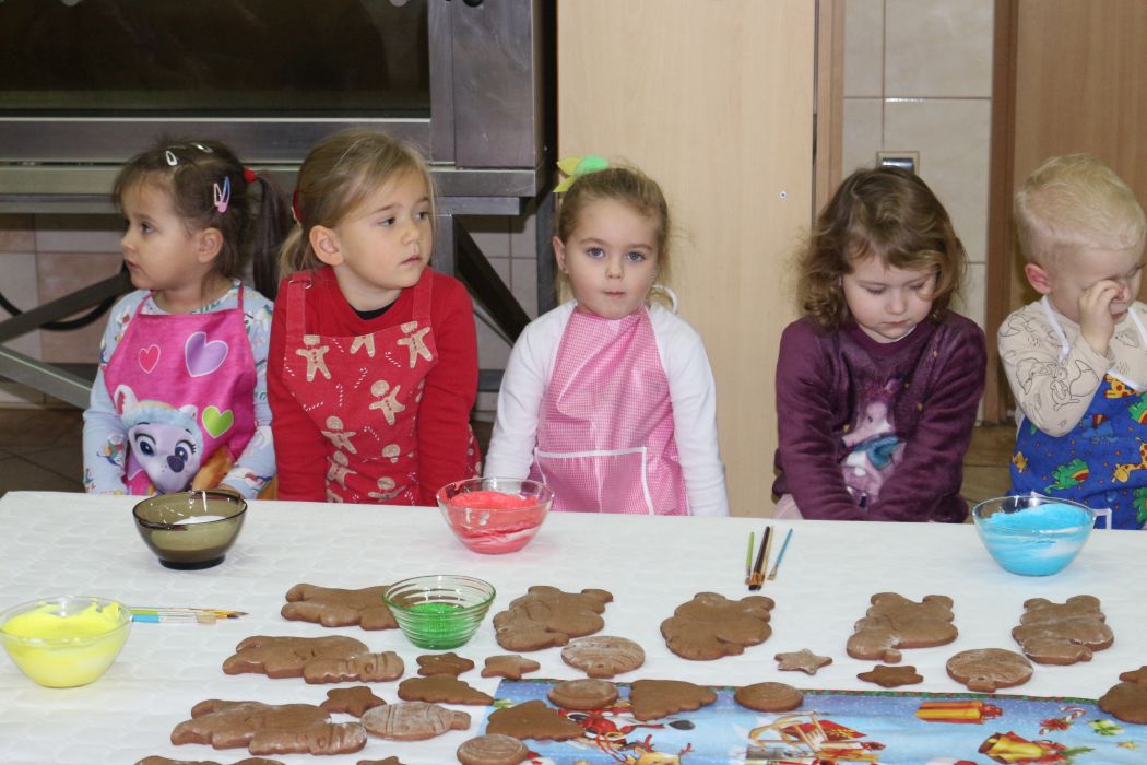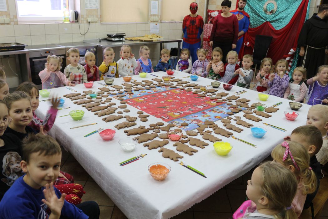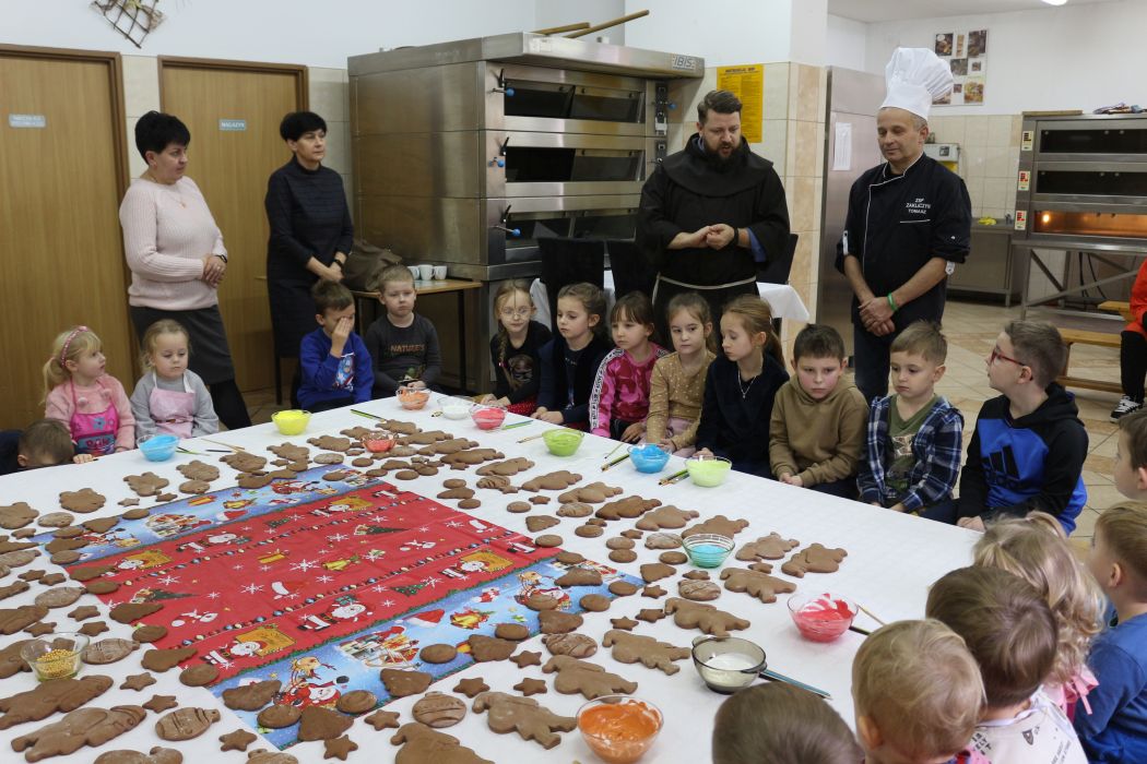 Spotkanie rozpoczęło się od wystąpienia o. Szymona Wierzbiaka z Klasztoru Ojców Franciszkanów z Zakliczyna. Duchowny uświadomił dzieciom jak piękny i radosny jest okres Świąt Bożego Narodzenia i oczekiwania na narodziny Jezusa. Następnie mali „piernikarze” przystąpili do wyrabiania, formowania i wycinania różnorodnych kształtów z ciasta. Po upieczeniu dekorowali lukrem i kolorowymi posypkami. Powstawały bardzo ciekawe i jakże pomysłowe wzory na piernikach - pyszny, kolorowy lukier smakował wszystkim milusińskim.