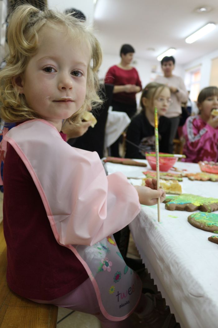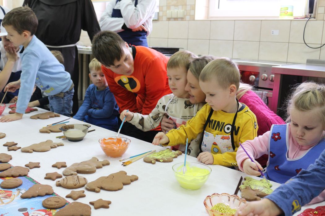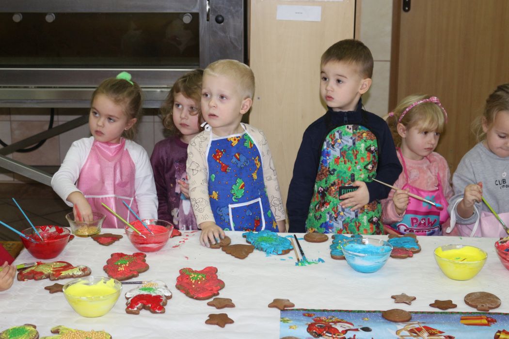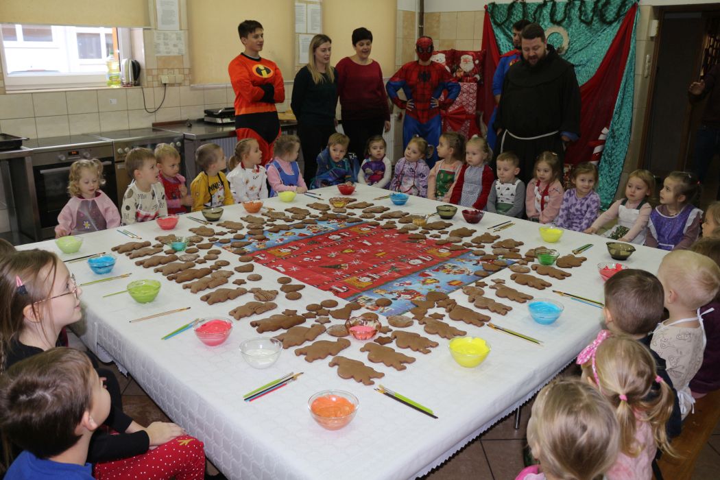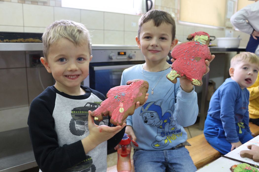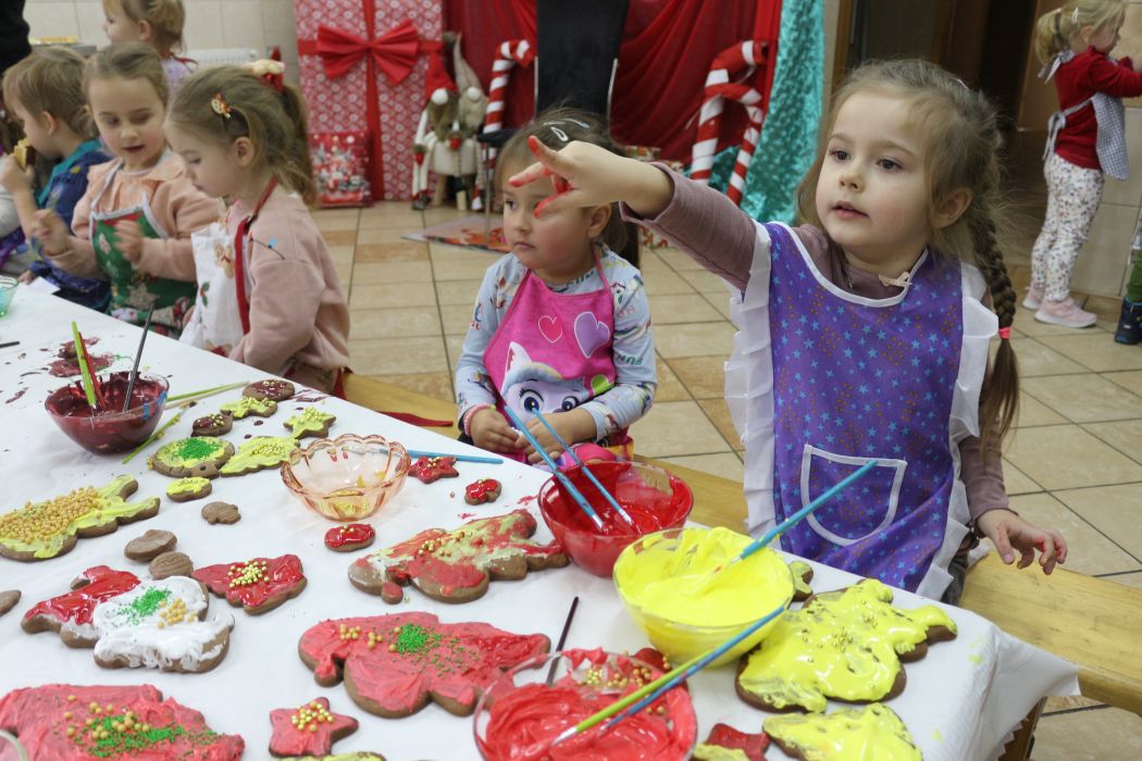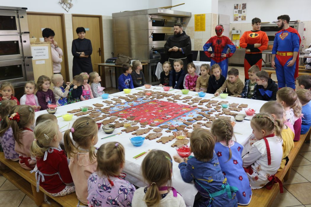 Spotkanie rozpoczęło się od wystąpienia o. Szymona Wierzbiaka z Klasztoru Ojców Franciszkanów z Zakliczyna. Duchowny uświadomił dzieciom jak piękny i radosny jest okres Świąt Bożego Narodzenia i oczekiwania na narodziny Jezusa. Następnie mali „piernikarze” przystąpili do wyrabiania, formowania i wycinania różnorodnych kształtów z ciasta. Po upieczeniu dekorowali lukrem i kolorowymi posypkami. Powstawały bardzo ciekawe i jakże pomysłowe wzory na piernikach - pyszny, kolorowy lukier smakował wszystkim milusińskim.