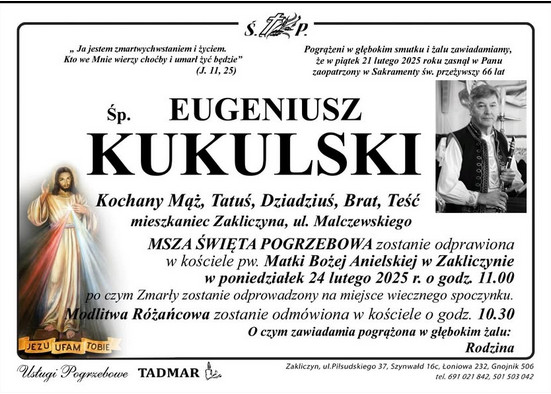 Z wielkim żalem przyjęliśmy wiadomość o nagłej śmierci ś.p. Eugeniusza Kukulskiego, emerytowanego nauczyciela Zespołu Szkół Ponadpodstawowych w Zakliczynie, kolegi i przyjaciela, który odszedł 21 lutego 2025 roku.