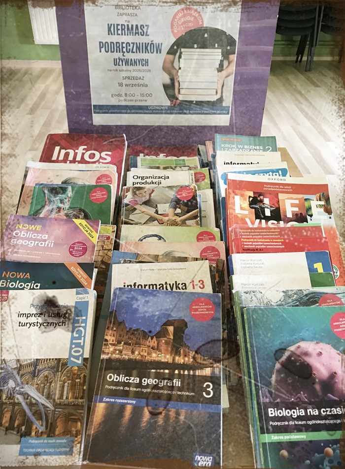 Zgodnie z tradycją naszej szkoły, 18 września br. odbył się w naszej bibliotece kiermasz podręczników, podczas którego uczniowie mieli okazję sprzedać i kupić używane książki, w tym podręczniki, repetytoria maturalne oraz książki zawodowe. Akcja cieszyła się jak zawsze dużym zainteresowaniem – wielu uczniów nabyło brakujące podręczniki w atrakcyjnych cenach. Dzięki kiermaszowi zyskały zarówno domowe biblioteczki, jak i cała szkolna społeczność.