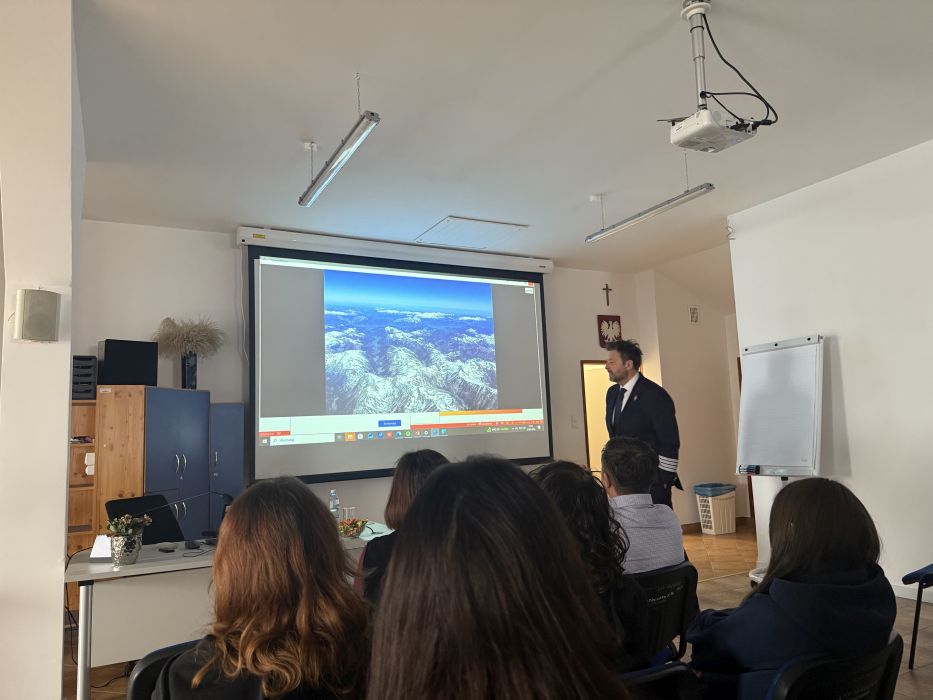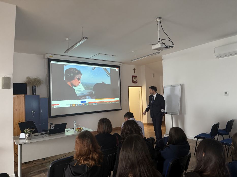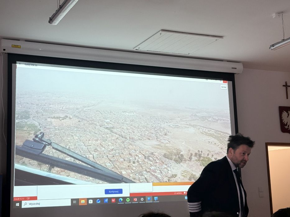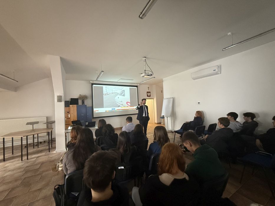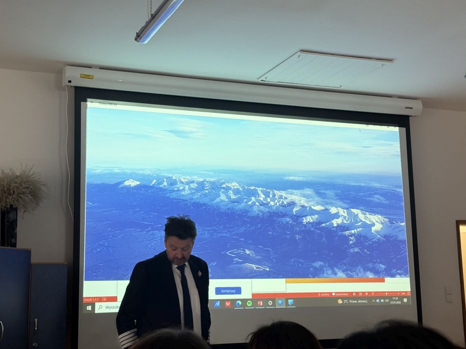 27 stycznia w naszej szkole odbyło się wyjątkowe spotkanie z kapitanem Piotrem Czubanem – pilotem samolotów pochodzącym z Roztoki k.Zakliczyna, który przyjechał podzielić się swoją pasją i opowiedzieć o swej drodze do spełnienia zawodowych marzeń. Była to fascynująca prelekcja przybliżająca tajniki lotnictwa, pracę w chmurach oraz obsługę maszyn. Każdą opowieść pan kapitan wzbogacał zdjęciami i filmami nagranymi podczas lotów i ćwiczeń. Pan Piotr podkreślał znaczenie nauki matematyki, fizyki czy języków obcych, a także omówił konieczność zdobycia licencji pilota poprzez odpowiednie szkolenia i egzaminy. Dużym zainteresowaniem cieszyły się ciekawostki związane z lotami, bezpieczeństwem oraz sytuacjami awaryjnymi.