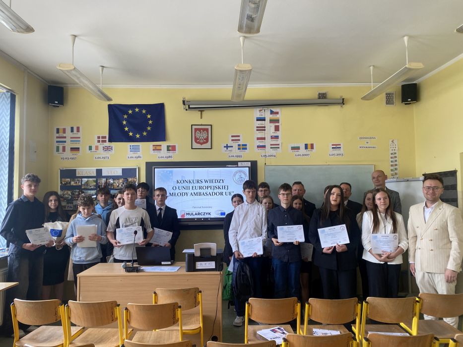 Kulminacyjnym punktem wydarzenia było uroczyste wręczenie nagród laureatom Konkursu Wiedzy o Unii Europejskiej „Młody Ambasador UE”, objętego honorowym patronatem Pana Europosła Arkadiusza Mularczyka. Dzięki jego wsparciu troje zwycięzców już wkrótce wyruszy na wizytę studyjną do Parlamentu Europejskiego! W konkursie udział wzięło aż 29 uczniów z gmin Ciężkowice, Gromnik, Wojnicz i Zakliczyn. Serdecznie gratulujemy wszystkim uczestnikom - za imponującą wiedzę, zaangażowanie i pasję do tematyki europejskiej! I miejsce zajął Piotr Gucwa ze Szkoły Podstawowej im. Wincentego Witosa w Gromniku. Na drugiej pozycji uplasował się Filip Popiela z Niepublicznej Szkoły Podstawowej w Pławnej. Trzecie miejsce należało do Anny Roman ze Szkoły Podstawowej im. gen. Stanisława Maczka w Olszynach.