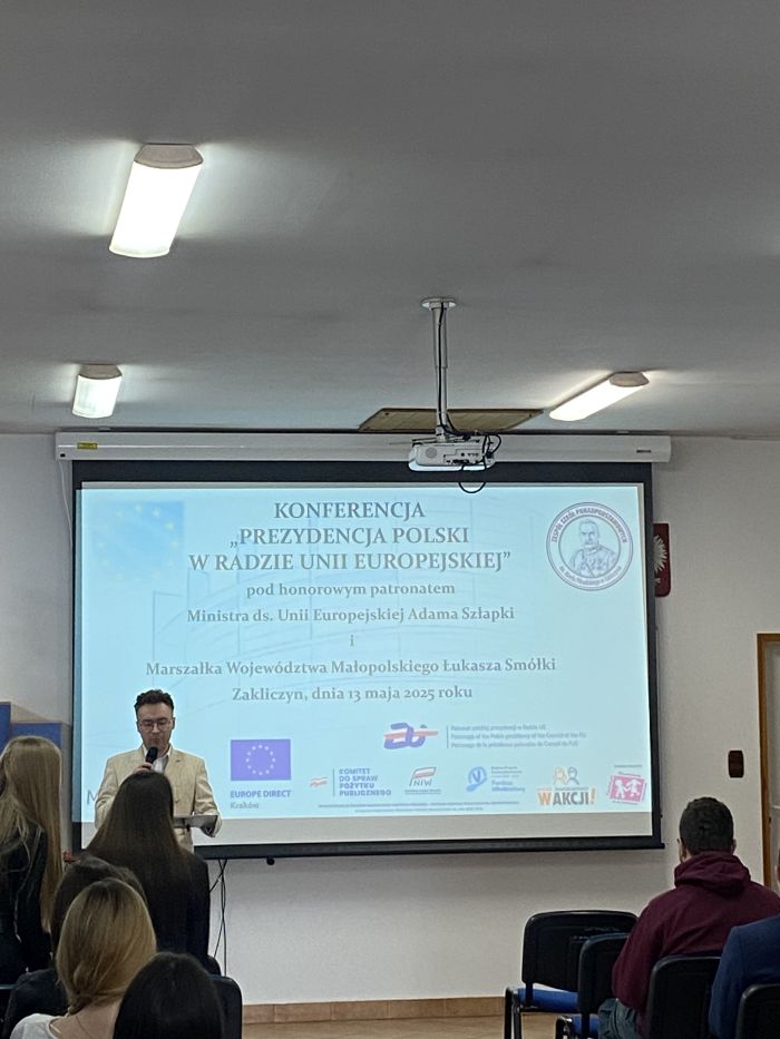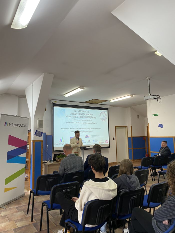 13 maja 2025 roku nasza szkoła stała się gospodarzem wyjątkowej Konferencji pn. „Prezydencja Polski w Radzie Unii Europejskiej”. Wydarzenie to, zorganizowane pod honorowym patronatem Ministra ds. Unii Europejskiej pana Adama Szłapki oraz Marszałka Województwa Małopolskiego pana Łukasza Smółki, przyciągnęło uwagę uczniów oraz przedstawicieli środowisk naukowych i samorządowych.