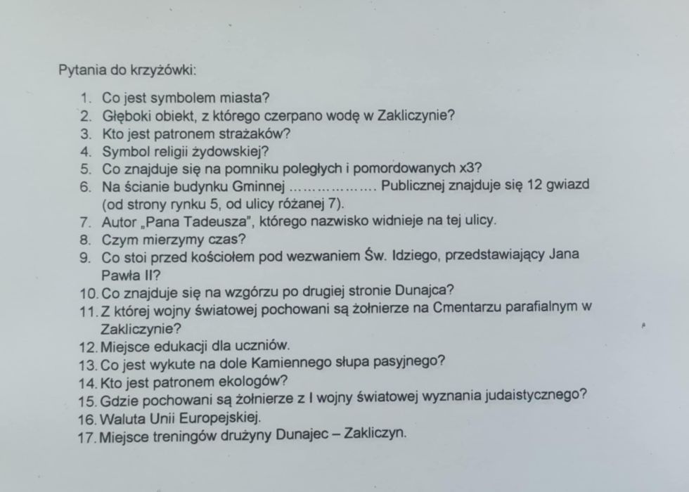 W mieście Zakliczyn pojawiło się 17 FASOLEK w miejscach turystycznych, edukacyjnych, sportowych, religijnych i historycznych wraz z kodami QR, na których można przeczytać więcej informacji na temat danego obiektu. Plan miasta pomoże odnaleźć fasolki w wyznaczonych miejscach. Na pierwszych 7 kamieniach, na odwrocie znajdują się litery, z których można ułożyć hasło. Zachęcamy również do wspólnej zabawy podczas gry miejskiej, rozwiązywania krzyżówki oraz rebusów. Powodzenia.
