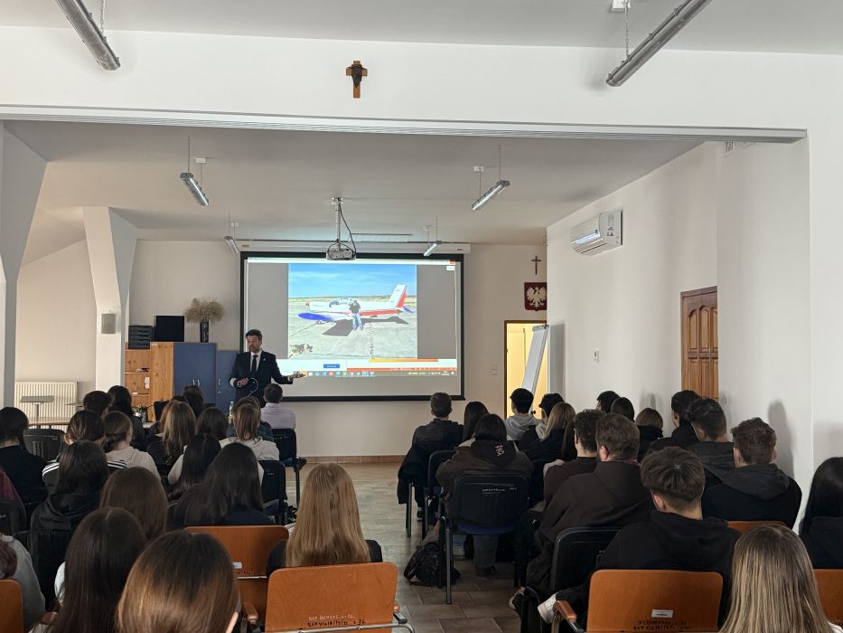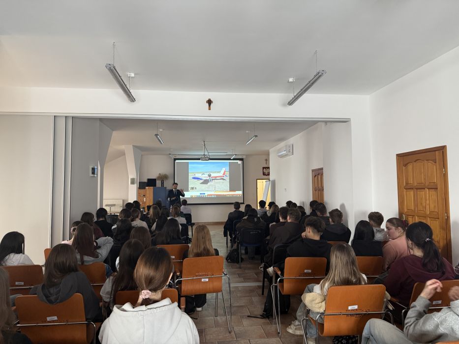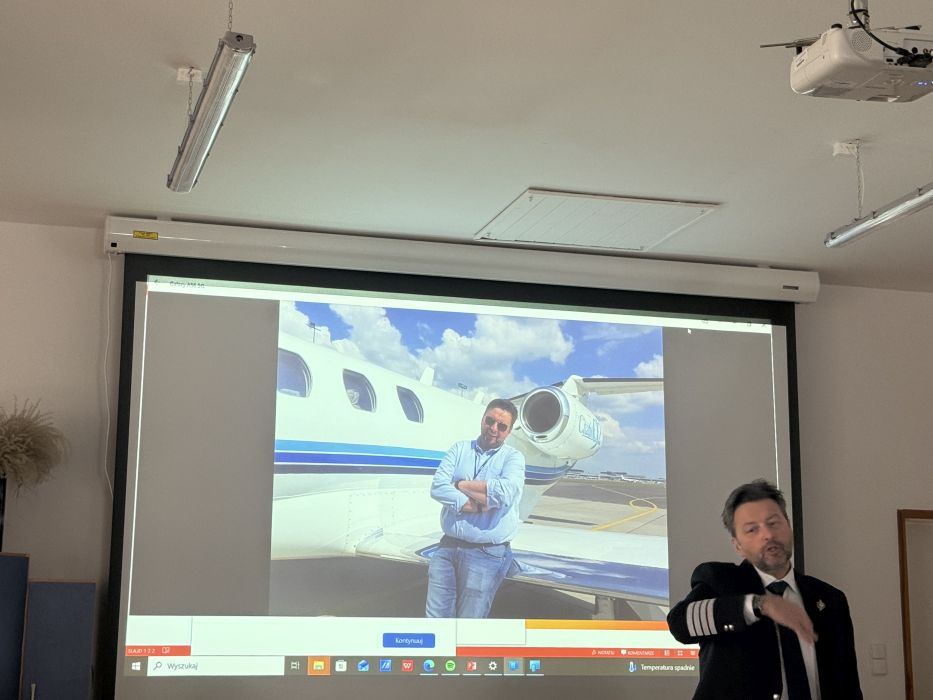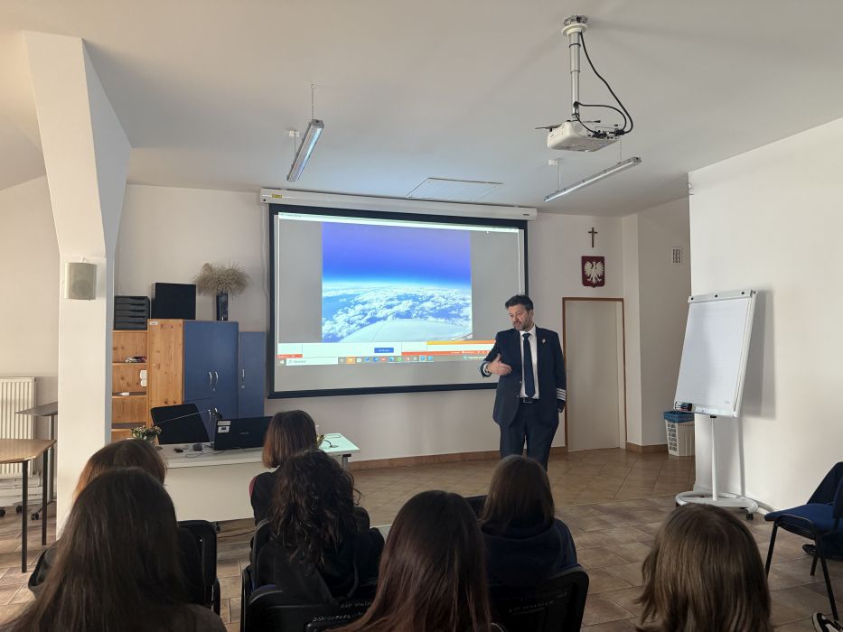27 stycznia w naszej szkole odbyło się wyjątkowe spotkanie z kapitanem Piotrem Czubanem – pilotem samolotów pochodzącym z Roztoki k.Zakliczyna, który przyjechał podzielić się swoją pasją i opowiedzieć o swej drodze do spełnienia zawodowych marzeń. Była to fascynująca prelekcja przybliżająca tajniki lotnictwa, pracę w chmurach oraz obsługę maszyn. Każdą opowieść pan kapitan wzbogacał zdjęciami i filmami nagranymi podczas lotów i ćwiczeń. Pan Piotr podkreślał znaczenie nauki matematyki, fizyki czy języków obcych, a także omówił konieczność zdobycia licencji pilota poprzez odpowiednie szkolenia i egzaminy. Dużym zainteresowaniem cieszyły się ciekawostki związane z lotami, bezpieczeństwem oraz sytuacjami awaryjnymi.
