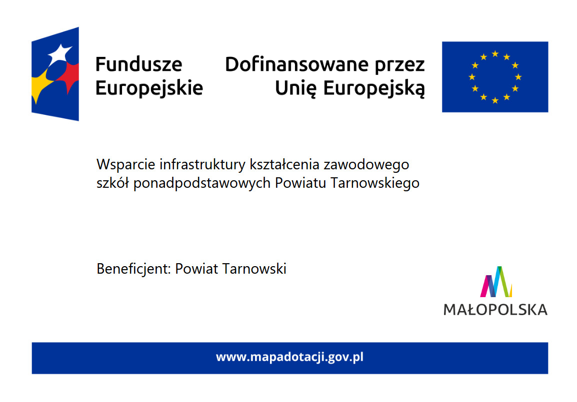 Powiat Tarnowski realizuje projekt „Wsparcie infrastruktury kształcenia zawodowego szkół ponadpodstawowych Powiatu Tarnowskiego” w ramach Programu Fundusze Europejskie dla Małopolski 2021 - 2027 Działanie 5.3 Infrastruktura kształcenia zawodowego Typ A wsparcie infrastruktury szkół ponadpodstawowych prowadzących kształcenie zawodowe
